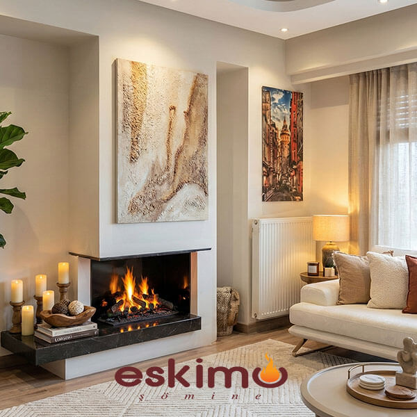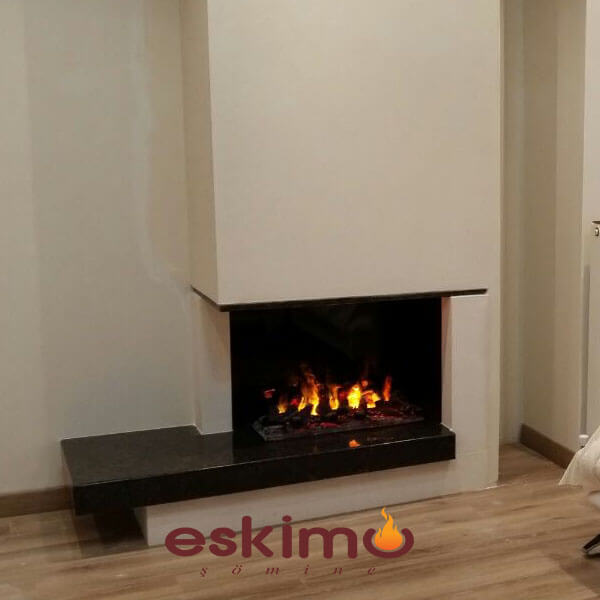 3d L Tipi Elektrikli Şömine ETE-045 modeli beyaz limra Taşı ve siyah granit çerçeve uygulanmış elektrikli hazne uzaktan kumanda kontrol duman alev efekti buharlı şömine modeli.