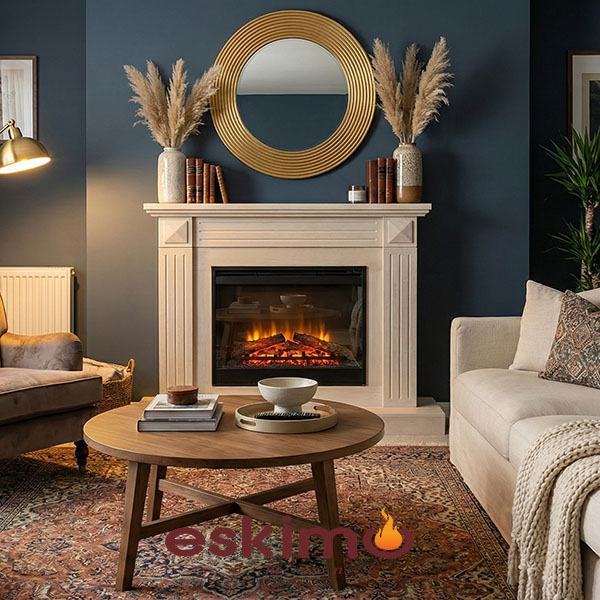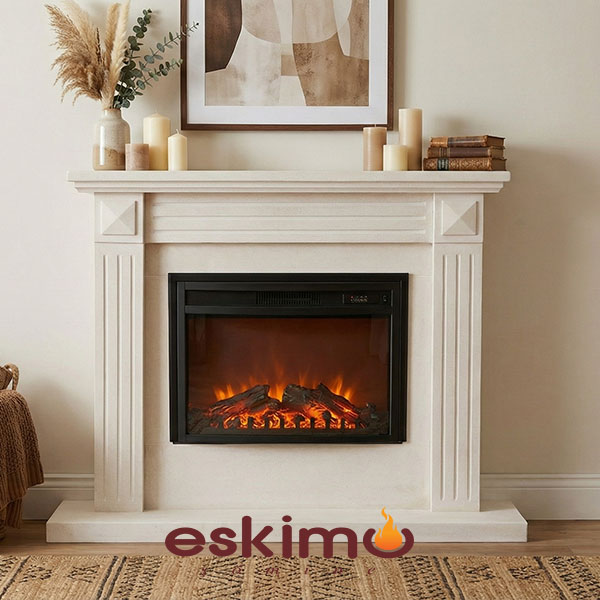 Elektrikli Şömine ETE-030 Modeli, Doğaltaş beyaz limra taşı ( limestone ) ve siyah granit uygulama, 2 boyutlu uzaktan kumandalı bağımsız alev efektli hazne ile uygulanmış klasik tasarım model.