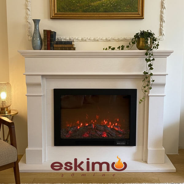 Elektrikli Şömine ETE-033 Modeli Beyaz Limra Taşı ve Siyah Granit Uygulama 2 boyutlu Hazne . Doğaltaş Beyaz Limra Taşı ( Limestone ) veya Masif Ahşap olarak uygulana bilen Uzaktan kumanda kontrol fonksiyonlu ısıtma özelliğinden bağımsız alev efektli ile kullanımı kolay ve pratik model.