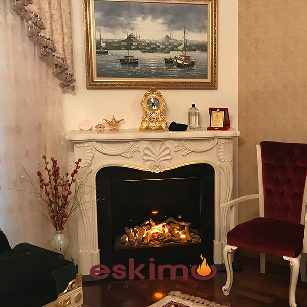 Elektrikli Şömine ETE-058 Oyma Modeli, Oyma beyaz limra taşı ve siyah granit uygulanmış bacasız şömine modeli. 3 boyutlu uzaktan kumandalı elektrikli hazne uygulanmış şömine modeli. Köşelerin kullanımı için tasarlanmış 120 x 120 cm'lik alan kaplayan klasik sevenler için uygun bir modeldir.