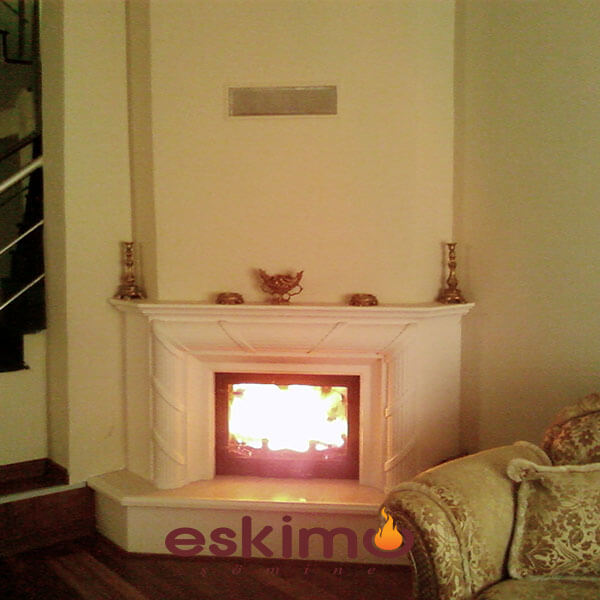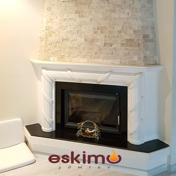 Eskimo klasik şömine modelleri arasında bulunan bu şöminemizde beyaz limra taşı ve siyah granit uygulanmıştır. Bu ürün köşelere uygulanabilmektedir yani köşe klasik şömine modelidir. Kullanımı için gerekli minimum alan 120x120 cm'dir.