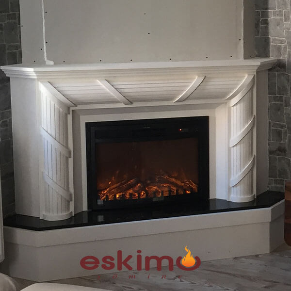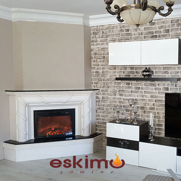 Beyaz Limra Taşı ( Limestone ) ve Siyah Granit uygulanmış köşe şömine modeli. İçerisinde 2 boyutlu uzaktan kumandalı bağımsız alev efektli elektrikli hazne. Arzu çi kısmına farklı cihazlar uygulanabilir. Farklı ebat ve özelliğe sahip fiyat farkı yansıtılarak yapılabilir. Köşeye uygulanmış tv ünitesi ile bütünleşmiş klasik model şömine dış giydirme. Farklı granit veya mermer uygulanabilir. Bu model için gerekli olan ölçü 120 x 120 cm boş bir köşe olması yeterlidir. Köşede girinti çıkıntı vs. bulunmakta ise onun ölçüsüne göre üretilir. Köşe Elektrikli Şömine modelleri evinizin dekorasyonunu tamamlamak için kullanabileceğiniz vazgeçilmez ürünlerden biridir. Bacası bulunmayan mekanların alternatif ürün gruplarından biride bu ürünlerdir.