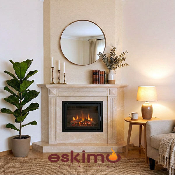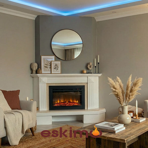 Köşe Elektrikli Şömine Modeli ETE-044 beyaz limra taşı ve 2 boyutlu elektrikli şömine hazne ile uygulanmış bir model . Köşede yaklaşık 90 – 90 ile 120 – 120 cm gibi alan kaplayan köşe modeller uygulana bilmektedir. Üst kısımları tercihe göre tavana kadar alçıpan ile kapatılabilir veya raf şeklinde yapılabilir.
