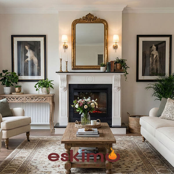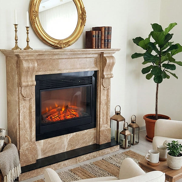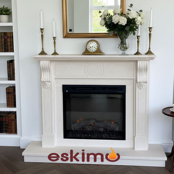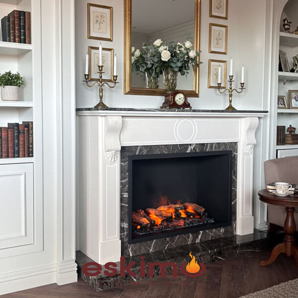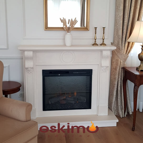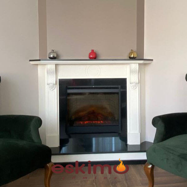 Tv Altı Şömine olarak da nitelendirilen bu model beyaz limra taşı ve siyah granit uygulanmış klasik şömine modeli ve Dimplex elektrikli şömine ile tamamlanmıştır.Salonda Ahşap dolaplar ile şömine bütünlüğü sağlanması için istenilen ölçüde üretilerek montajı yapılmıştır.